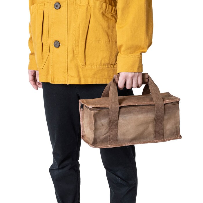 撥水性のあるパラフィン加工生地でつくられた、雨の日でも使いやすいスクエアトートバッグです。中身が飛び出しにくいファスナーつきのフタと、小さいアイテムをまとめて収納できるメッシュポケットがついているので、食器などのキャンプグッズを持ち運ぶのはもちろん、車内の荷物整理にも重宝します。丈夫で使い勝手がよく、使わないときはコンパクトに折りたたむこともできるので、車内に複数常備しておくと便利ですよ。