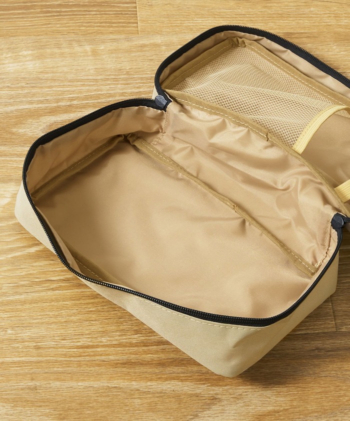 淡いベージュの防災ポーチは、日常生活でも十分使えそうなデザインです。なかには、細かいアイテムを小分けで収納できる内ポケットがついています。平ゴムもついているので、コードやケーブルをきれいにまとめておけるでしょう。