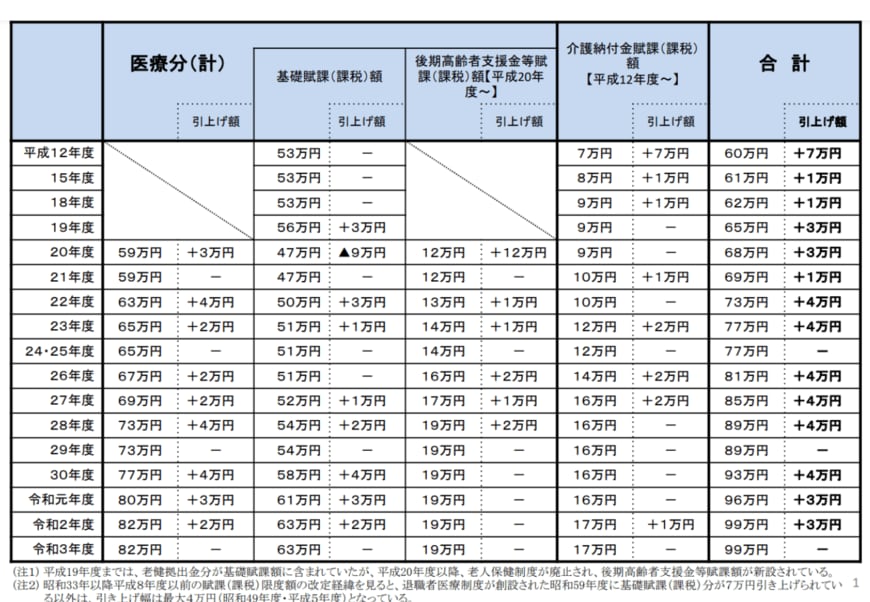 なお、国民健康保険料の上限引き上げは2022年4月にも実施されており、基礎賦課分2万円・後期高齢者支援金等賦課分1万円の合計3万円(保険料上限102万円)となりました。