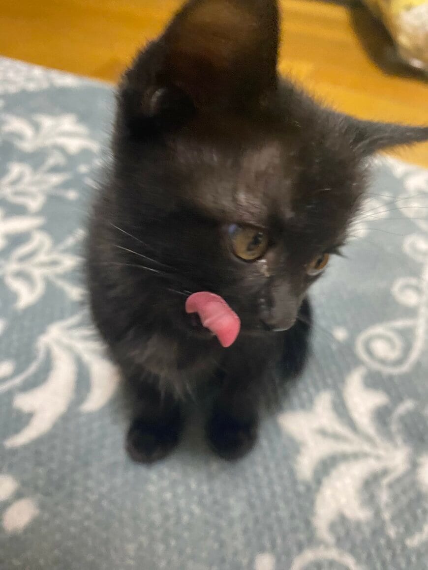 真っ黒な毛並みと、あどけなさを感じるちっちゃな体が印象的な「ウニちゃん(仮名)」。このときは、どうやらご飯を済ませた後だったようです。