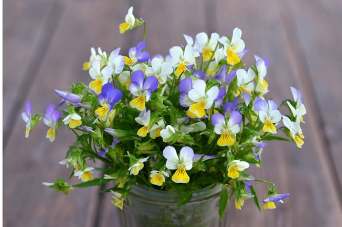 パンジーやビオラは繊細な茎や葉が特徴の草花。爽やかでナチュラルな寄せ植えを作りたい人は、ハーブとの寄せ植えもオススメです。