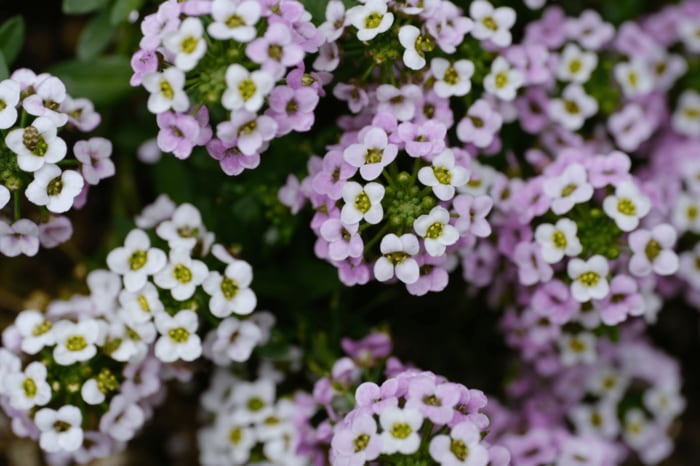 小花が可愛いアリッサムはパンジーやビオラを引き立てます。アリッサムの花色は白と紫がメイン。パンジーの花色に合わせて選ぶのがオススメです。