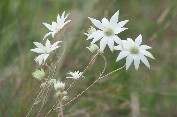 オフホワイトのシンプルな花とモスグリーンの茎葉がオシャレなフランネルフラワー。春と秋に開花する多年草で、花や茎葉がネルシャツの生地・フランネルのような手触りがすることが名前の由来となっています。