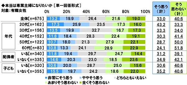 同調査で有職女性(675名)に本当は専業主婦になりたいか聞いたところ、全体では「そう思う(計)」は33.0%、「そう思わない(計)」は40.6%でした。