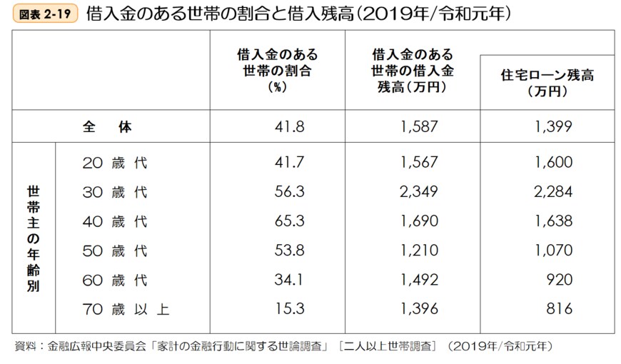 金融広報中央委員会が行った調査を見ると、借入金のある世帯は、世代別に以下の通りとなっています。