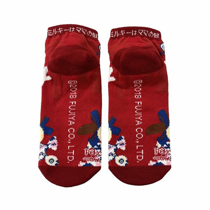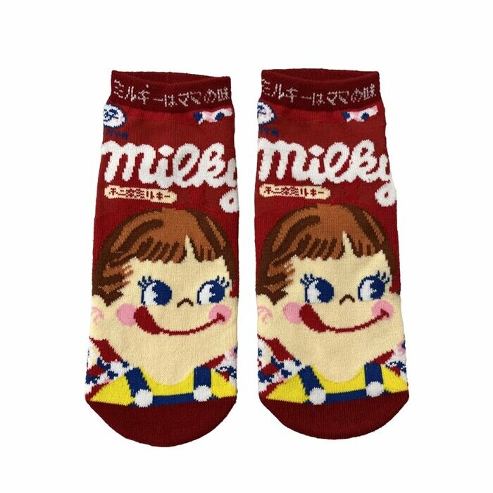 ミルキーペコちゃんがデザインされた靴下です。柄の展開は3種類で、「メニーフェイス」「ペコ」が発売中。どれもペコちゃんがにっこり笑っている目を引くイラストがあしらわれています。靴を脱ぐたびにこちらも笑顔になれますよ。