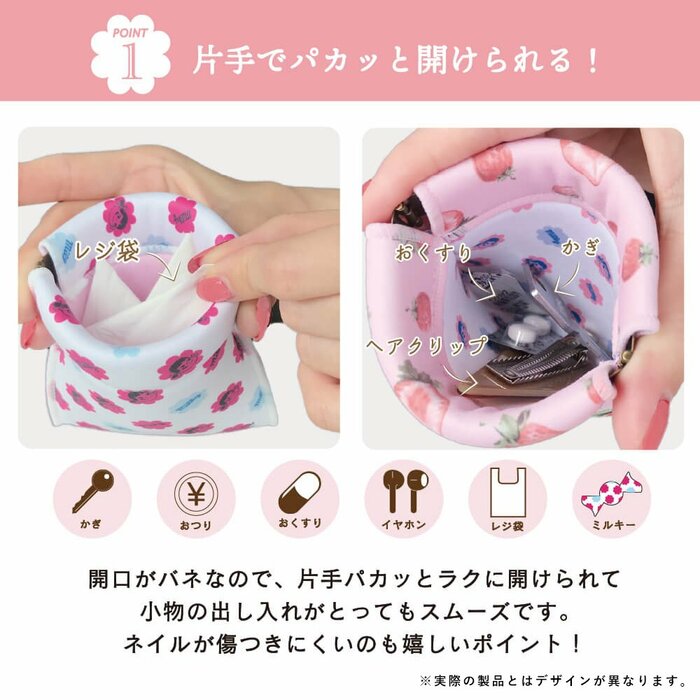 アクセサリー、イヤホン、常備薬、ミルキーなど、ちょっとした小物収納にぴったりなポーチです。バネポーチなので、片手でぱかっと開けられて出し入れもスムーズ。本体サイズも小さめでマチもないので、ポケットや小さめのカバンなどにも嵩張らずに入れられます。