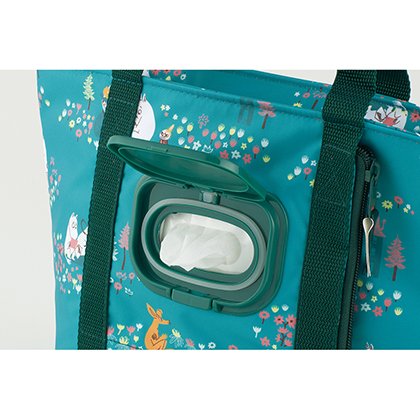 「ウェットティッシュポケット付ランチバッグ ムーミン」は、市販のウェットティッシュを入れられるフタ付きポケットを備えたランチバッグです。バッグの側面にウェットティッシュのフタがあり、ワンプッシュで開きます。指先が汚れていても、手の甲などで押せば開くのがうれしいですね。パッキン付きで乾燥を防げます。