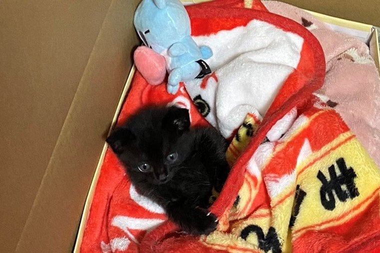 ダンボールのなかでは、ウニちゃんの真っ黒くて小さな体が、赤色の毛布に包まれています。ちっちゃな手をちょこんと出す姿に、心が癒されてしまいます……!