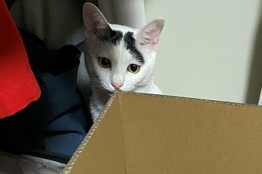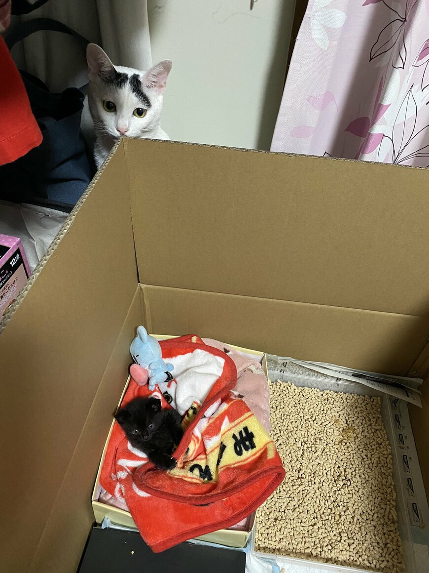 「わらび兄貴が興味津々です」という書き込みとともに投稿されたのは、1枚の写真でした。写真に写っているのは、先住猫の「わらびくん」と、保護されて4日目の「ウニちゃん(仮名)」です。