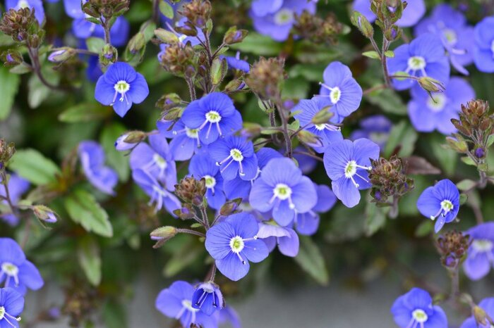 グランドカバーにオススメのベロニカ・オックスフォードブルーはクリスマスローズとも相性ピッタリの多年草。花が咲く時期が少しずれていますが、葉は冬になると銅葉に変わります。大人っぽいシックな印象が好みの方にオススメです。※参考価格:400~600円前後(3号ポット苗)