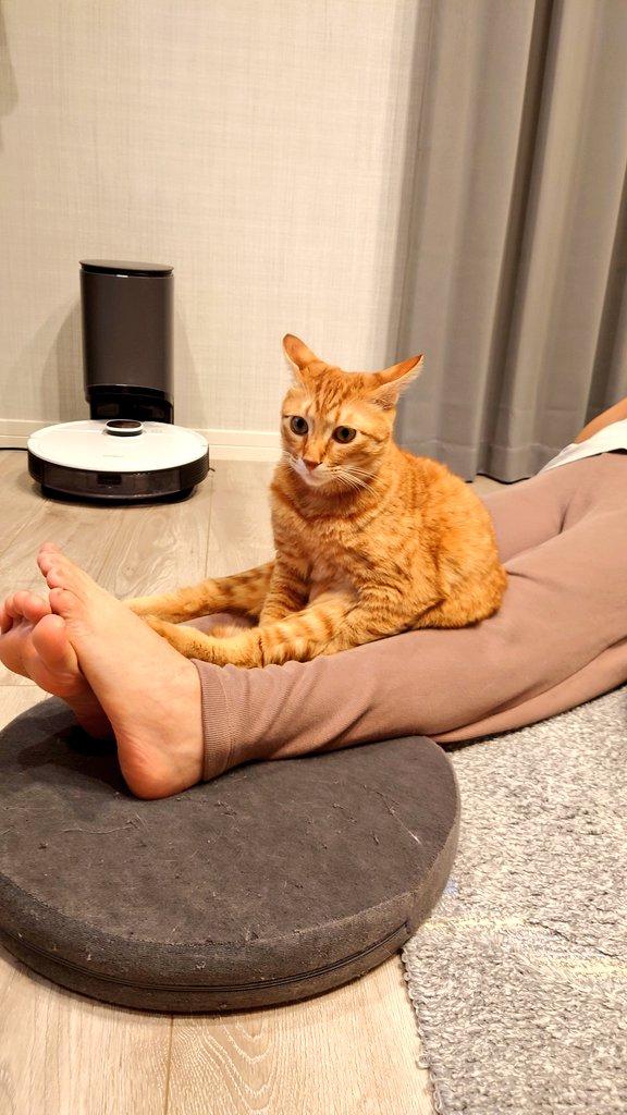 脚を伸ばした飼い主さんの上に座っていますが、その座り方がなんだか印象的……!