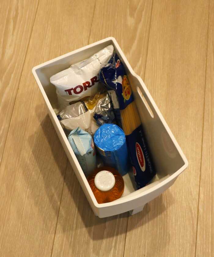 シンク下など足元でも使えます。両サイドが取っ手として使える形状なので、掃除用のボトルや重い瓶の調味料などを入れても持ちやすいですよ。