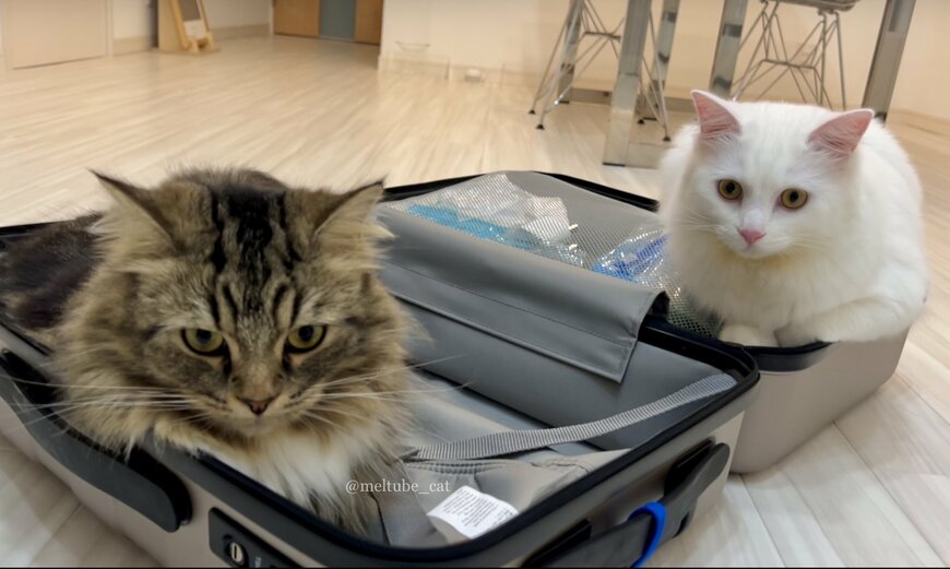 写真に写っているのは、出張準備をしているであろう飼い主さんのスーツケース。そしてその両側を、我が物顔で陣取っている2匹の猫ちゃんです。