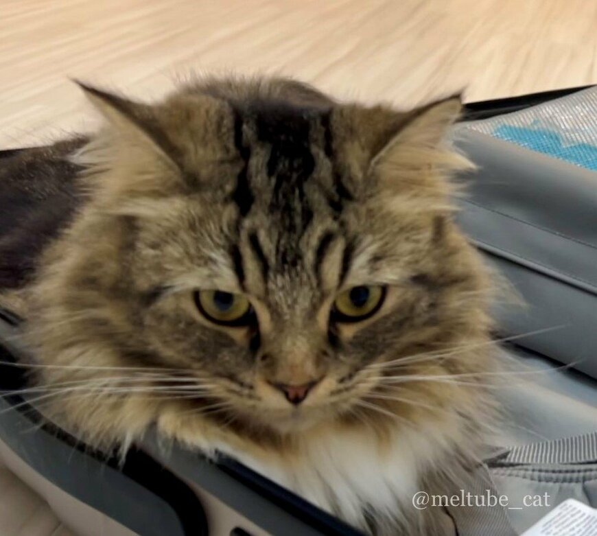 スーツケースの左側を陣取っているのは、キジ猫の男の子「メル」くん。モフモフの体を、バッグの角にスッポリとフィットさせて座る姿が愛らしい……!