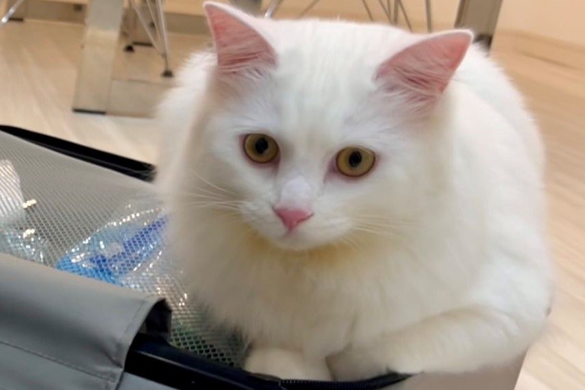 スーツケースに手を掛ける白猫「マオ」くん