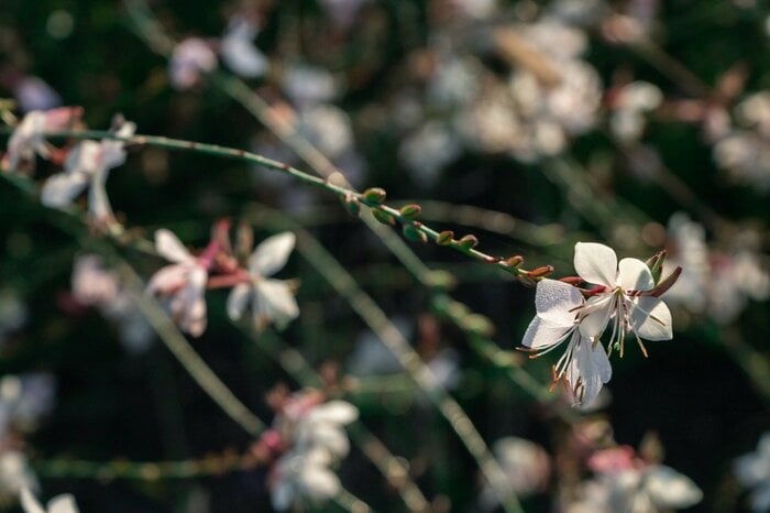 細く長く伸ばした茎の先に、蝶のような可憐な花を咲かせるガウラ。梅雨前から晩秋にかけ長期間開花する多年草で、別名「ハクチョウソウ」とも呼ばれています。