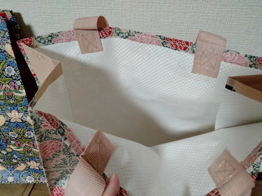 【セリア】のモリスデザインの「割布ハンドルバッグ」は大き目サイズで使いやすい! 割布だから傷つきにくい!