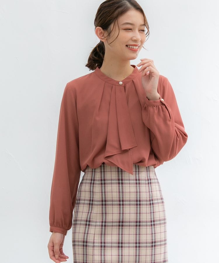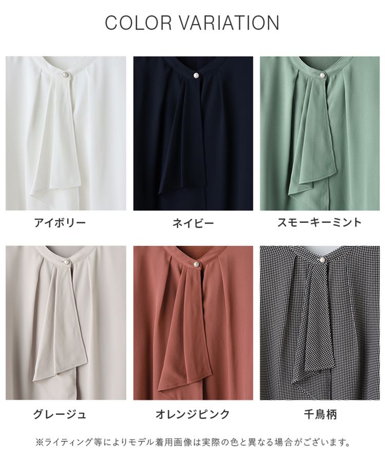 写真のようにボリュームがあるボウタイがおしゃれなブラウスです。胸元のパール調のボタンも素敵です。