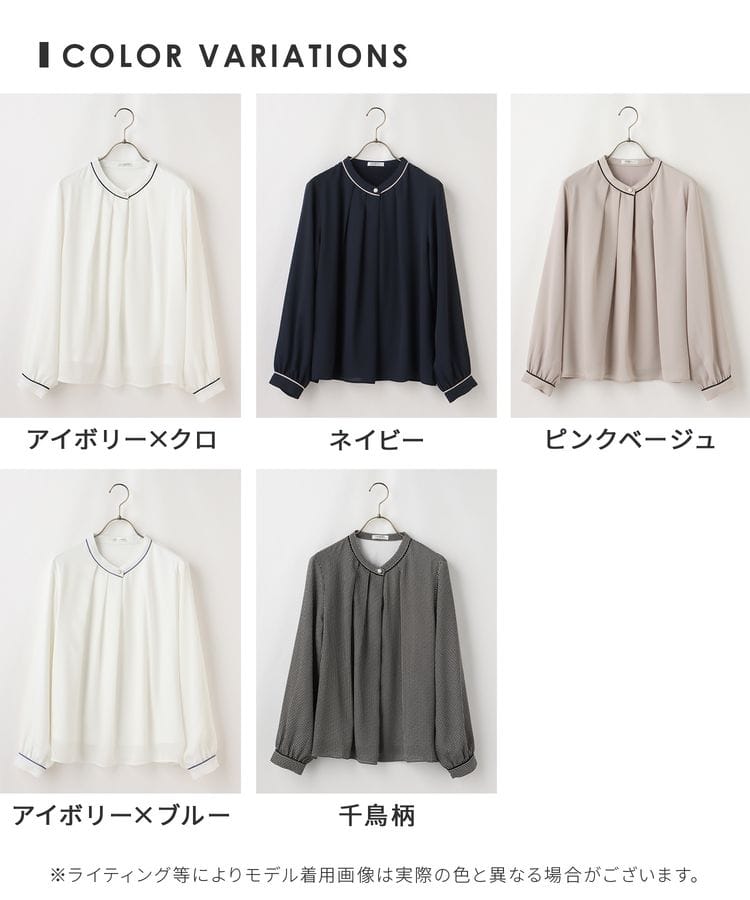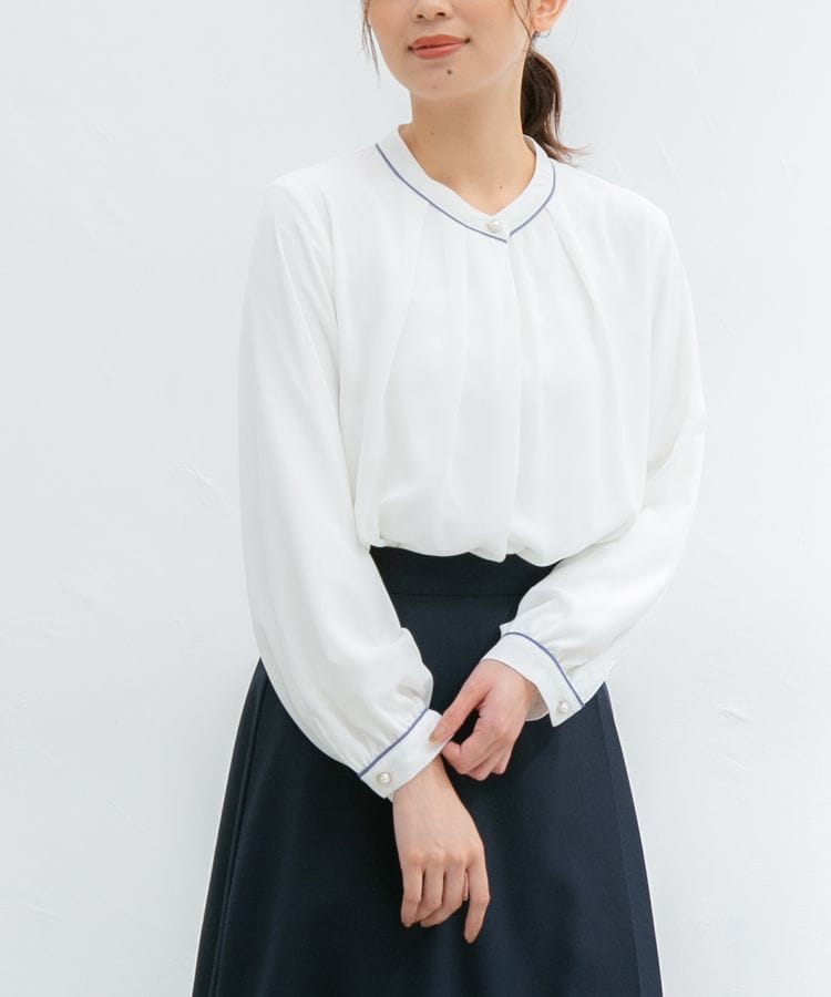 トレンドライクなバンドカラーと配色パイピングが魅力的なアイテムです。胸元と袖口のパール調ボタンも上品で素敵です。