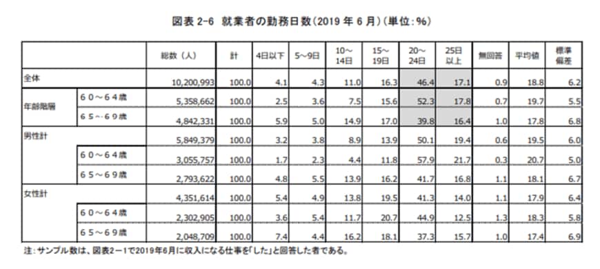 60歳代の就業者のうち1カ月に20~24日働く人と25日以上働く人を合算すると約60%。