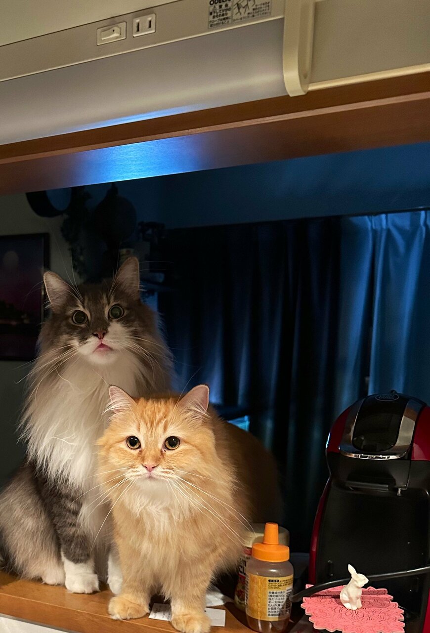 暗闇というシチュエーションと、猫ちゃん達の険しい表情が相まって、お部屋とキッチンにはホラーな雰囲気が漂っています……!