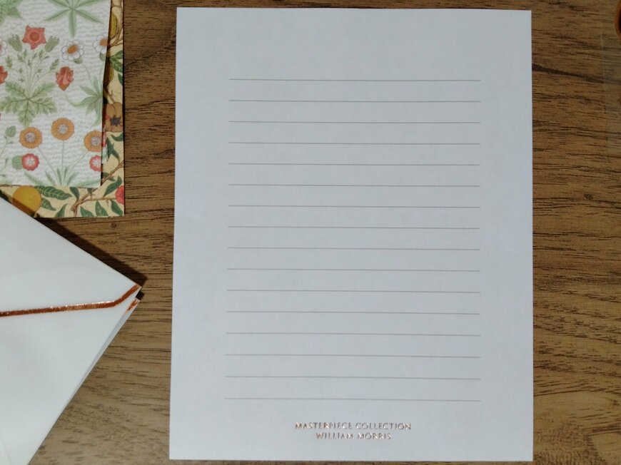 便せんの表側は写真のようにシンプルなデザインとなっています。下部にモリスのロゴがゴールドで入っているのがおしゃれです。