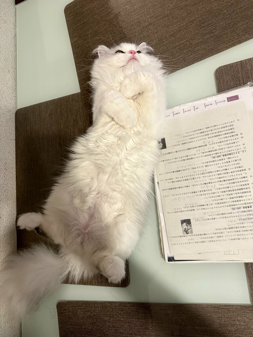 写っているのは、勉強用のテキストと見られる冊子と、その横にへそ天状態でゴロリと転がる白猫ちゃんです。