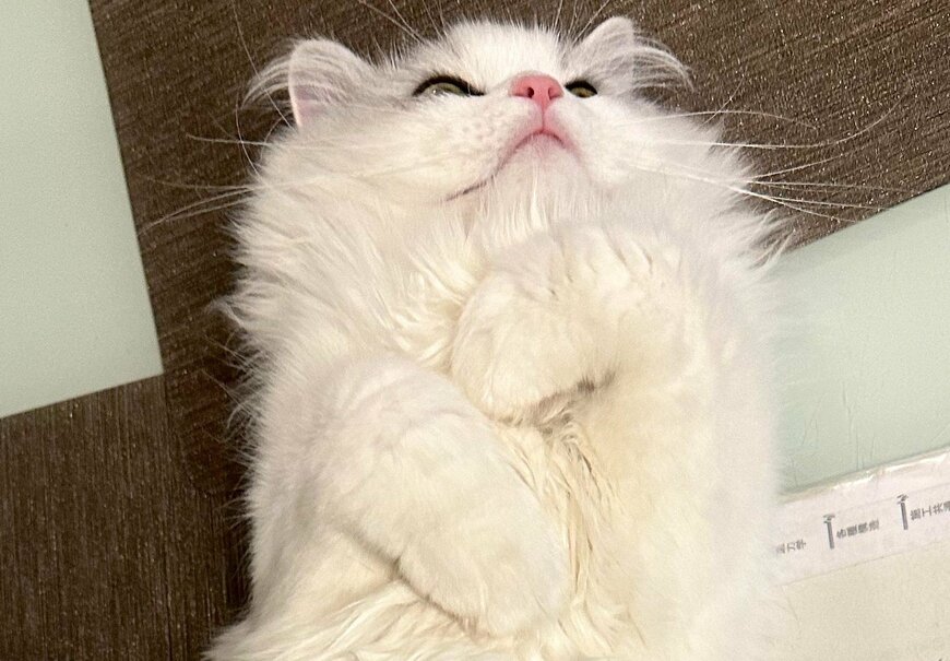 モッフモフのお腹を大胆に見せつける白猫さんは、ミヌエットの男の子「ノーマンくん」です。