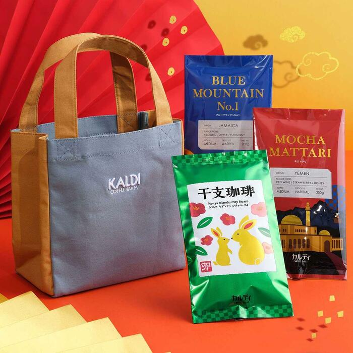 赤ワインを思わせる華やかな香りの「モカマタリ」、ブルーマウンテン100%の贅沢な味わいが楽しめる「ブルーマウンテンNo.1」、程よい苦みとフルーツの甘みの「干支珈琲 ケニア キアンドゥ シティ ロースト」の3種のコーヒーが入った福袋です。バッグはロゴの刺繍がワンポイントのスクエアトートとなっています。