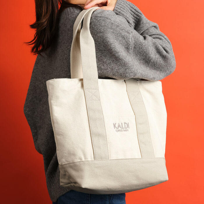 事前抽選販売の商品です。福袋限定のオリジナル商品や、和食材ブランド「もへじ」の干支柄エコバッグをはじめ、カルディコーヒーファームの人気商品が入っています。丈夫なキャンバス生地のトートバッグは、便利な内ポケット付き。開け口にはファスナーが付いているので荷物をしっかりとしまうことができます。