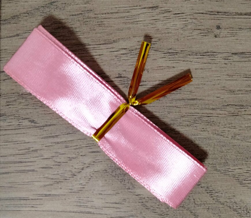 花がピンクでかわいいクレイのデザインのギフトバッグです。下の写真のように付属のリボンもピンクです。