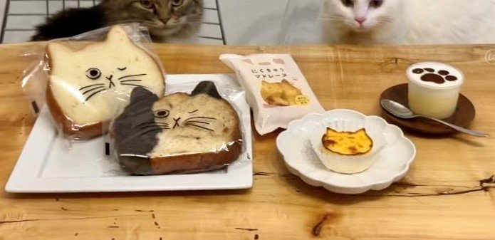 テーブルの上に並んでいる食べ物をアップで見てみると……?ツイートどおり、どれも可愛い猫ちゃんのモチーフが印象的です。