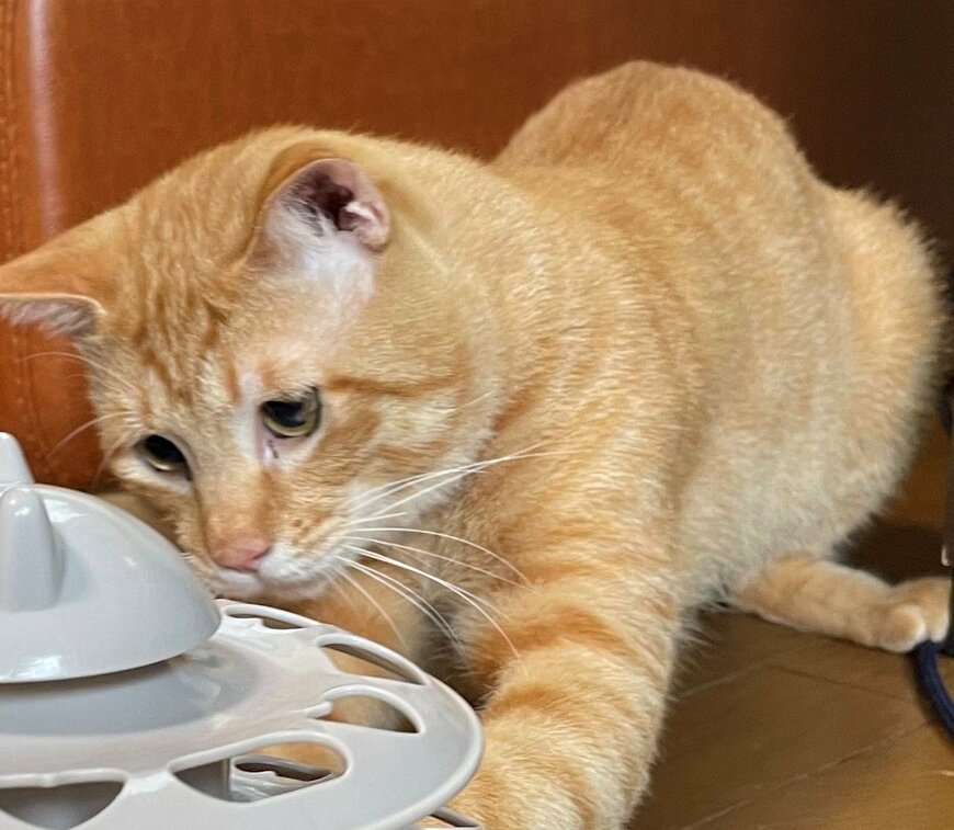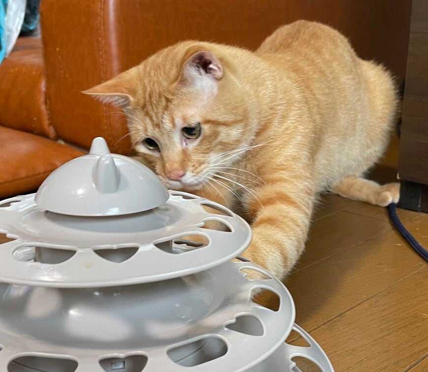 写っているのは、おもちゃに夢中になっている1匹の茶トラ猫ちゃん。名前はリチャードちゃんです。家族に保護されて、一緒に暮らすことになったといいます。