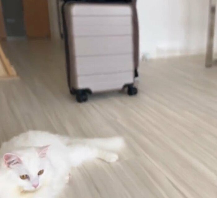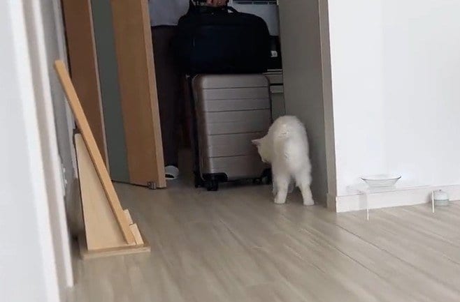 そして飼い主さんは、キャリーバッグを手に取り家を出る準備です。ドアのある方向に歩いていきます。