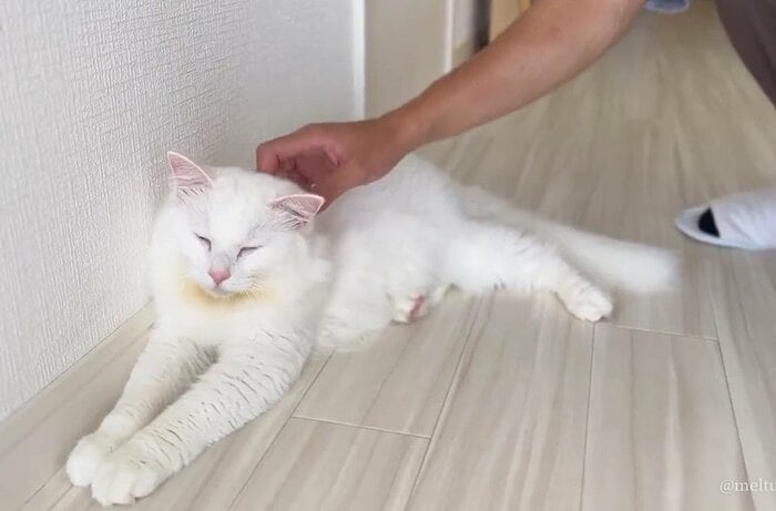 動画に写っているのは、白猫のマオくん。推定1歳の男の子です。動画の冒頭では、出勤前の飼い主さんがマオくんをナデナデ。とっても気持ちよさそうな表情を浮かべていますね。