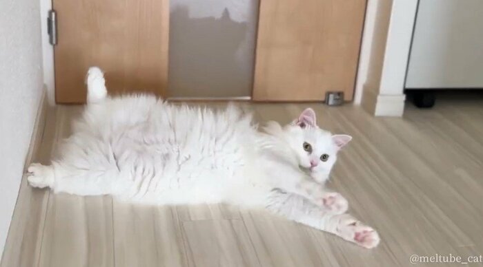 しばらくの間、ドアの前でお腹を出したまま過ごしていたマオくん。ラストでは、なんとも言い難い無の表情でカメラを見つめていました。