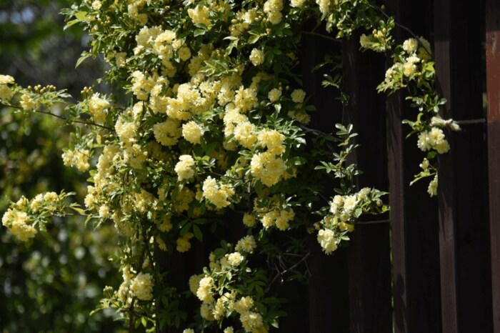 生育旺盛なモッコウバラはコンパクトスペースにもオススメです。ひと株植えると、外壁をバラで彩ることができます。