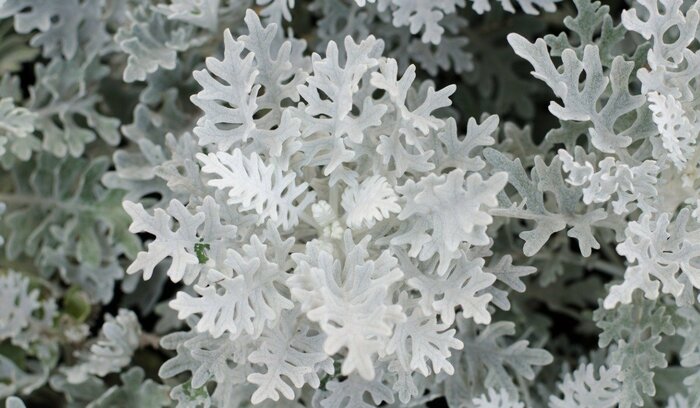 シルバーの葉が美しいシロタエギクは、花と一緒に植えてみたいリーフプランツ。パンジーやビオラなど、華やかな冬の一年草を上手に引き立てくれます。