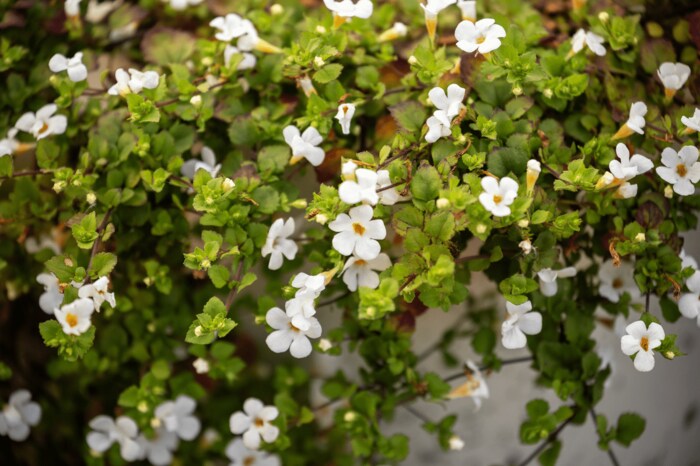 バコパは茎を横に広げながら、這うように伸びるのが特徴。鉢の手前に植えるとしだれて咲く小花がキュートです。冬は花数が少なくなりますが、常緑の葉が楽しめます。