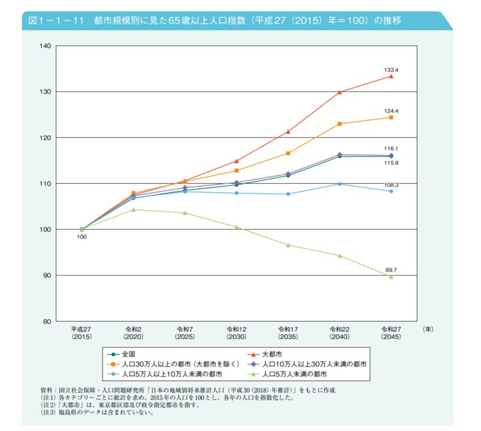 最も低いのは「人口5万人未満の都市」で89.7となっており、都市規模が大きいほど65歳以上の人口が増加する見込みとなっています。