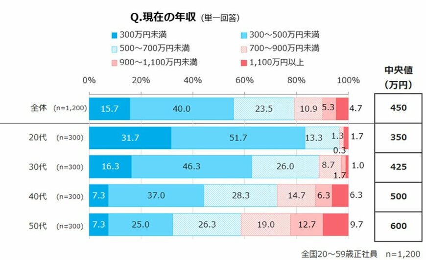 20代~50代の正社員に現在の年収を聞いたところ、以下のような結果となりました。