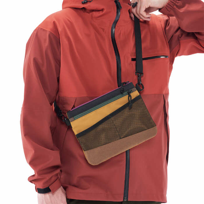 カラーが豊富なショルダーバッグ。ほど良いサイズ感、ベーシックな色味で使いやすいです。前面にファスナー付きポケットとメッシュポケット2つ、背面にボタン付きポケット、内側にポケット2つと、収納しやすいこだわりの仕様。さらに、水を弾きやすく、汚れがついても落ちやすい発酵加工を施しています。 Dカン付属なので、バックパックに取りつけることも可能です。
