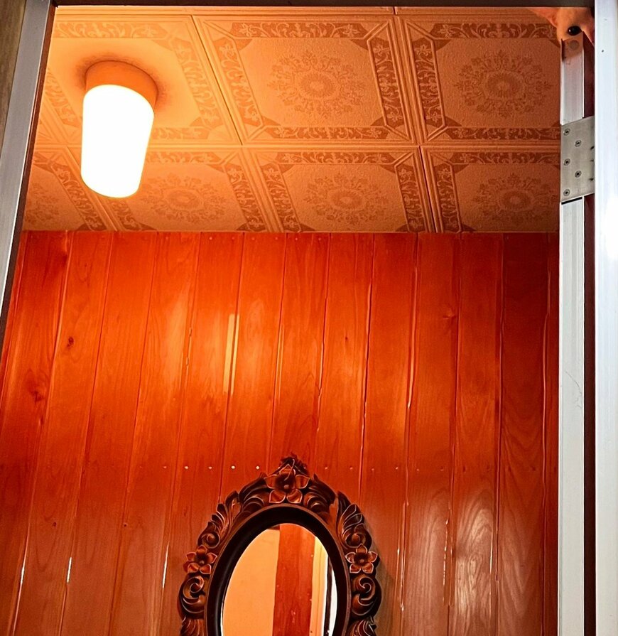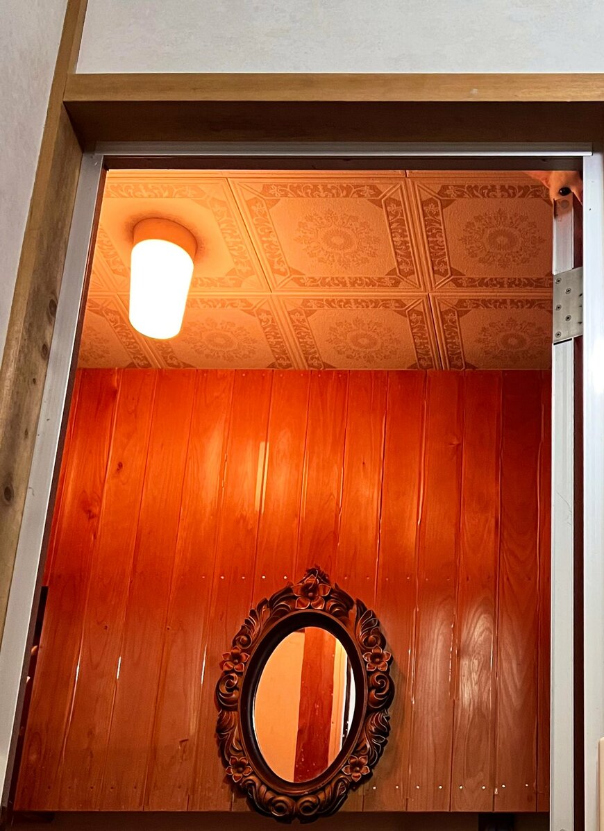 写真を見ると、開いたドアと向こう側の鏡が視界に入ってきますね。一見「何でビックリしたんだろう?」と思う写真ですが、猫ちゃんが写り込んでいたようです。