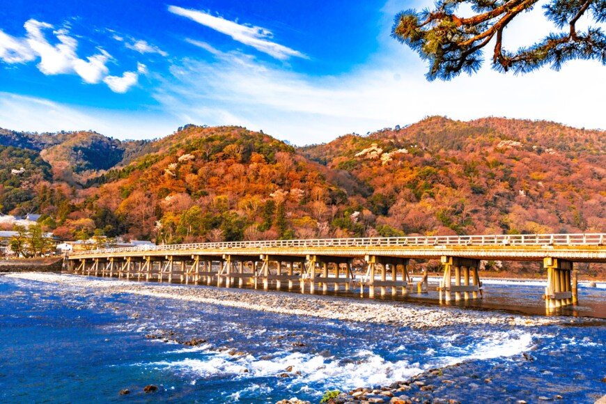 モミジやイチョウの木が多い嵐山では、紅葉の季節になると山々が美しい秋の姿に変貌します。