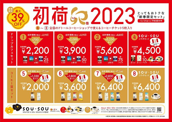 株式会社ドトールコーヒーでは、2022年12月26日(月)の発売に先駆け、11月10日(木)よりドトールコーヒーのショップにて数量限定新春セット「初荷2023」の予約を開始しました。