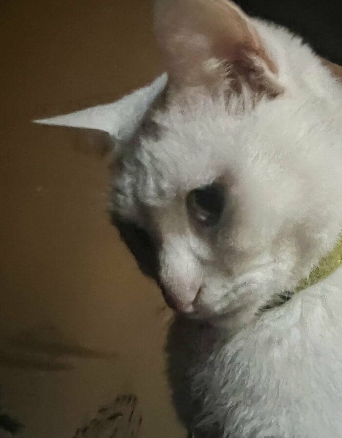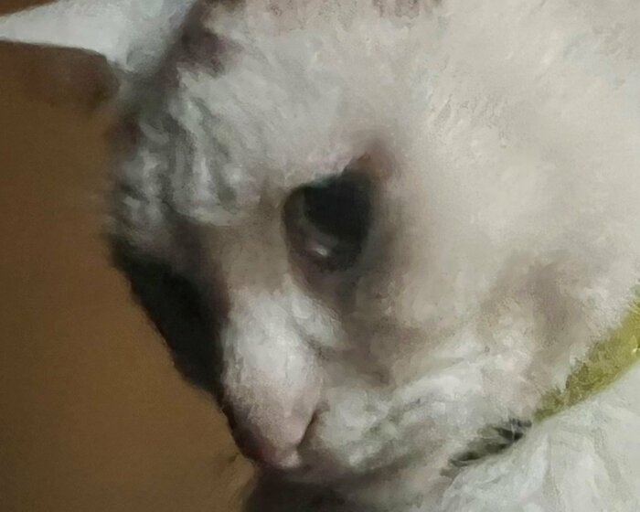 写真に写っているのは、白くてモフモフとした毛並みが印象的な1匹の猫ちゃん。なんといっても目に飛び込んでくるのは、猫ちゃんの表情です……!