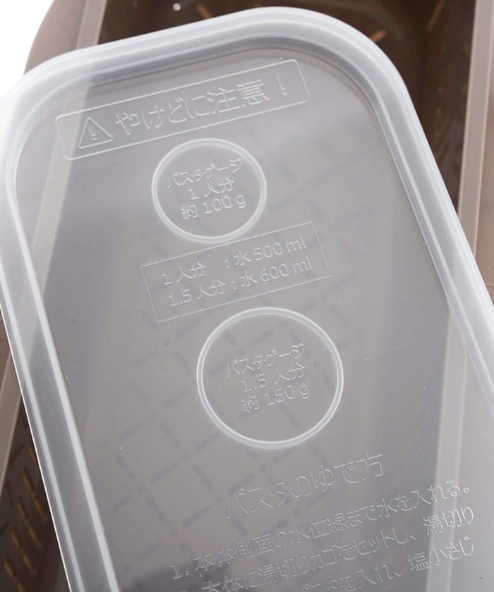 蓋に作り方の説明があり、蓋でパスタの量も計れます。パスタだけではなく、温野菜なども作ることができます。