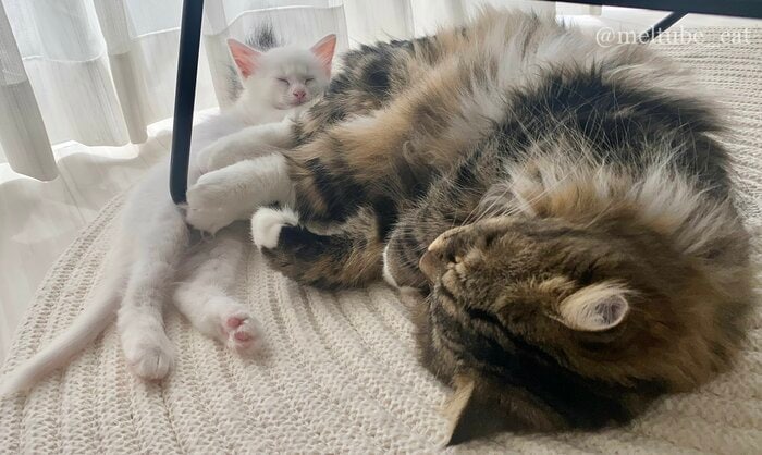 マオくんは生後2週間頃、時折雨の降る日に人の少ない場所で捨てられていたといいます。のちに現在の飼い主さんや、先住猫のメルくんと一緒に暮らすことになりました。