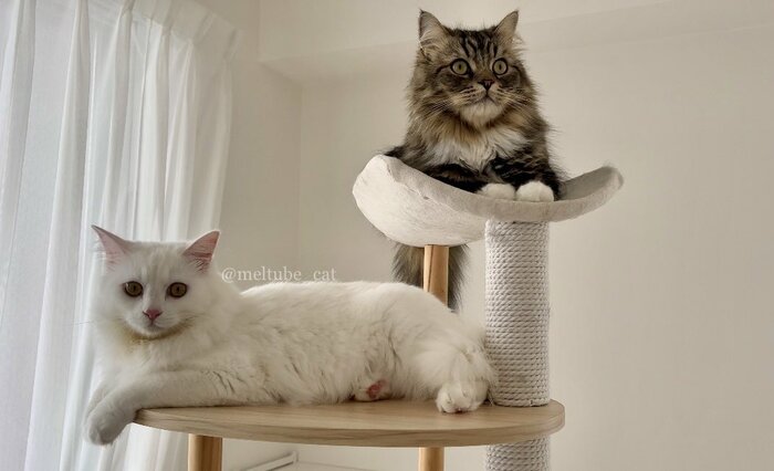 2枚目の写真には、1歳になったマオくんが写っていました。兄貴のメルくんと仲良くキャットタワーに座っていますね。